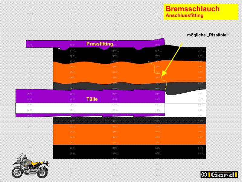 Meine Vermutung ist: Beim Verpressen des Fittings werden die einzelnen Schichten des Schlauchs gequetscht. Dort wo die Tülle im Schlauch endet wird der innere Schlauch in den freien Durchgang gepresst und es entsteht eine „Stufe“ (ist vollkommen übertrieben gezeichnet!). Der bei jedem Bremsvorgang erzeugte Druck „bewegt“ diese „Stufe“ und es entsteht auf Dauer eine Schwachstelle durch die etwas Bremsflüssigkeit in das Gewebe entweichen kann. Innerhalb der Presshülse tut sich natürlich nichts aber direkt dahinter wird der schadhafte Schlauch aufgeweitet.