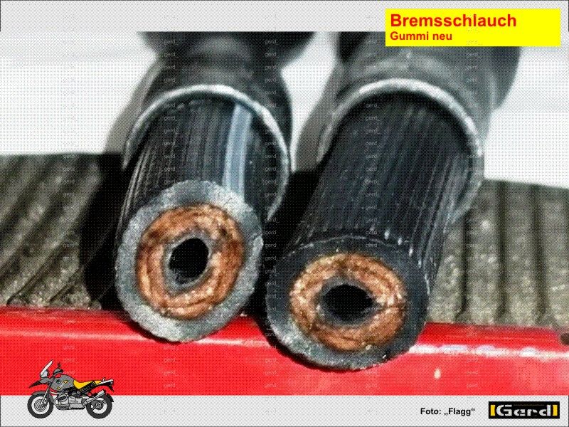 Auf dem Bild sieht man, dass der innere Schlauch "unsichtbar" und kein freier Durchlass zu erkennen ist. Wenn der innere Schlauch porös ist oder, nach meiner Meinung wahrscheinlicher, einen kleinen Riss hat, wird Bremsflüssigkeit in das Gewebe gedrückt. Auch wenn der Druck im gesamten System gleich ist wird der innere Schlauch zusammengedrückt weil die druckbeaufschlagte, wirksame Fläche von "aussen" grösser ist als von "innen" und somit von "aussen" eine grössere Kraft wirkt.