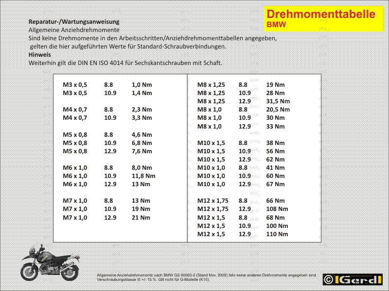 Allgemeine Anziehdrehmomente nach BMW GS 90003-2 (Stand Nov. 2009) falls keine anderen Drehmomente angegeben sind. Verschraubungsklasse III +/- 15 %. Gilt nicht für G-Modelle (K15).
