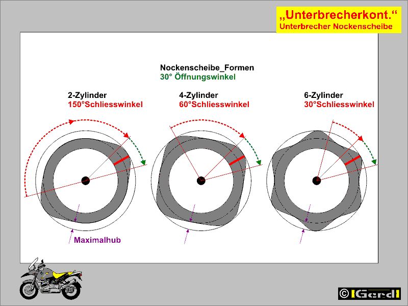 Die Grafik zeigt das schematisch (für einen Vierzylinder): Eine Nockenscheibe („Vierkant“), 1:1 gekoppelt mit der Nockenwelle und dem Verteiler, betätigt den mechanischen Unterbrecherkontakt.