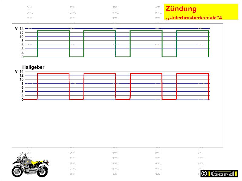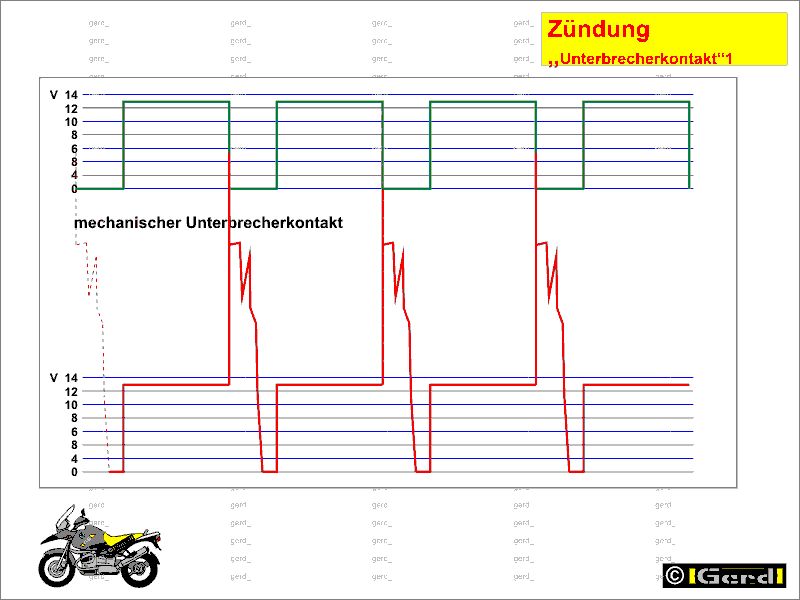 Der mechanische Unterbrecherkontakt schaltet eine induktive Last. Beim Einschalten liegt lediglich die Nennspannung des Bordnetzes an.