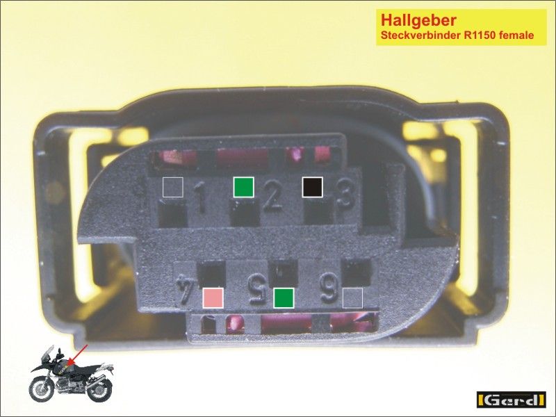 Der 6-pol. Stecker der R1150xx hat folgende Pinbelegung (female Seite / von der Hallschrankenplatte kommend): Pin 1 ist frei; PIN 2 grün;: Signalleitung S1; PIN 3 schwarz: Masse; PIN 4 rosa: +12V; PIN 5 grün;: Signalleitung S2 (ja, 2x grün;!); Pin 6 ist frei ).Die Farben der Kabel von der Hallgeberplatte bis zum Stecker scheinen nicht bei allen Einheiten gleich zu sein. Offenbar wurde teilweise verwendet „was grad da war“.Allerdings geht es auf der " male“ - Seite des Steckverbinders weiter wie gewohnt: