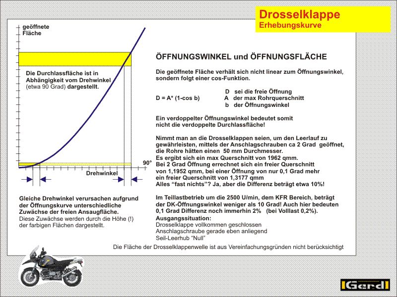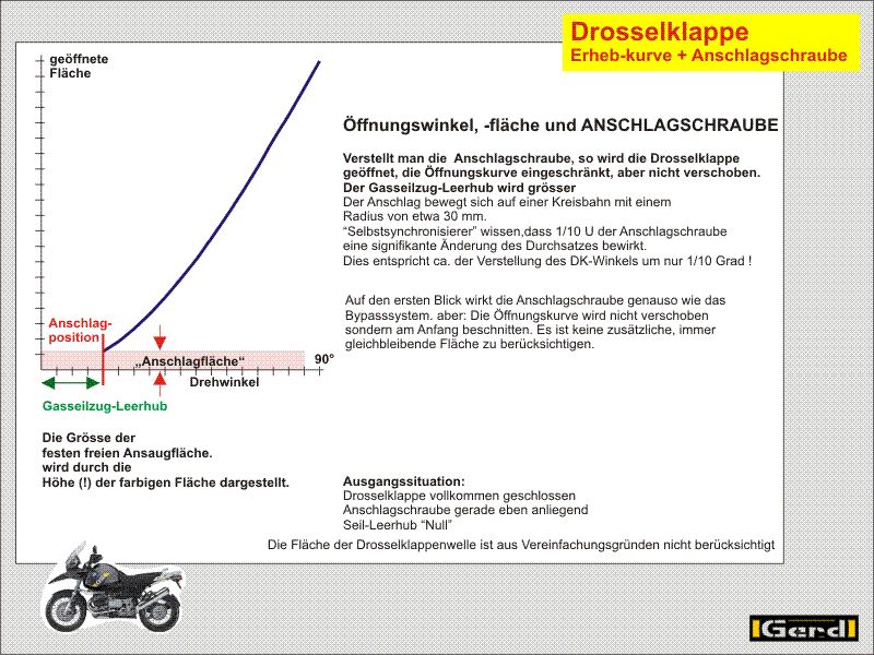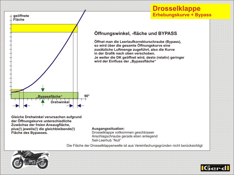 Um Toleranzen und Feinheiten ausgleichen zu können sind noch Bypasswege (an der Drosselklappe vorbei) vorhanden über die eine zusätzliche Luftmenge in den Zylinder gelangen kann. Diese Menge ist zwar mit der Stellschraube einstellbar aber NICHT abhängig von der Drosselklappenstellung und somit auch nicht drehzahlabhängig.