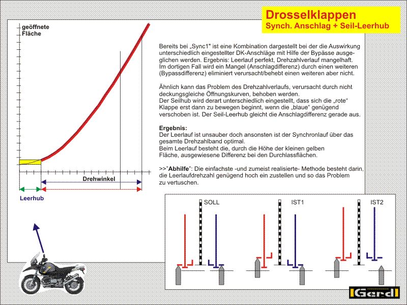 Die Gaszüge sind mit unterschiedlichem Leerhub eingestellt. Bei dem Zylinder, dessen Drosselklappe im Leerlauf geschlossener ist als die des Anderen, wurde die Leerlaufluftmenge durch den Bypass korrigiert. Zusätzlich sind die Leerhübe so eingestellt, dass die "geschlossenere“ Drosselklappe früher als die Andere zu öffnen beginnt. In der Übergangsphase wird zuerst nur die Drosselklappe dieses Zylinders geöffnet. Im Idealfall beginnt die zweite Drosselklappe gerade dann zu öffnen, wenn die erste exakt den Wert deren ("offenere“) Anschlagstellung erreicht hat. Ab diesem Punkt arbeiten sie synchron!