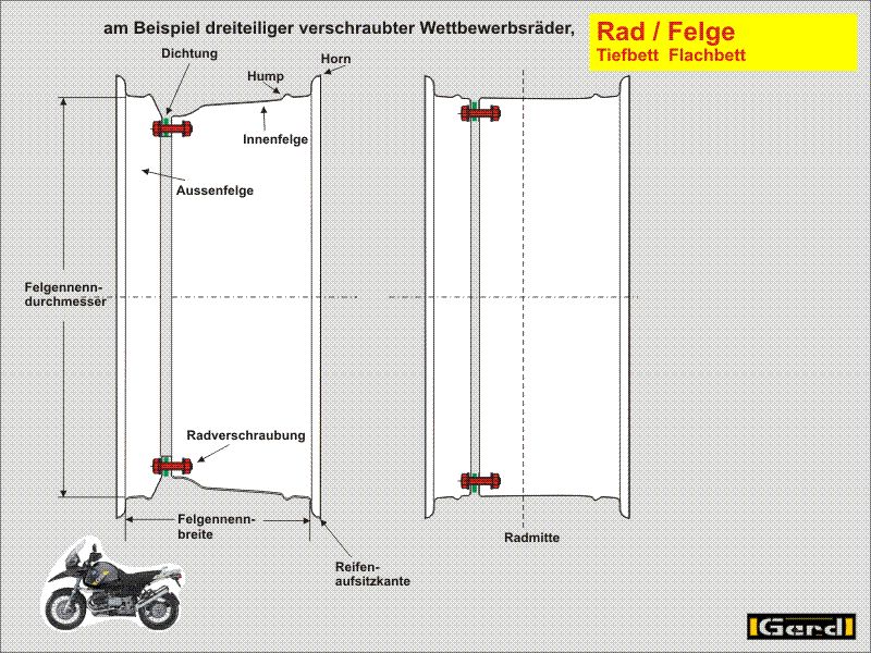 „x“ ist die Kennzeichnung für eine einteilige Tiefbettfelge (x wird als „mal“ gesprochen), „–„ (sprich „Strich“) bezeichnet eine mehrteilige Flachbettfelge.